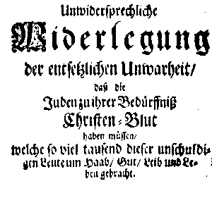 Abb. "Unwidersprechliche Widerlegung der entsetzlichen Unwarheit, Daß die Juden zu ihrer Bedürffnis Christen-Blut haben müssen, Welche so viel tausend dieser unschuldigen Leute, um Haab, Gut, Leib und Leben gebracht", anonym separat sowie Teildruck, enthalten in Sammelbänden von 1705 und 1707 (siehe unten).