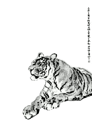 Abb. Hu Zaobin: "Tiger", zw. 1908 und 1942, Public Domain (modifiziert). In Edward Theodore Chalmers Werner: "Myths & Legends of China. With Thirty-two Illustrations In Colours By Chinese Artists", London / Bombay / Sidney: George G. Harrap & Co. Ltd. 1922, S. 66: "The Tiger Carries Off Miao Shan", in Cap. X: "The Goddess of Mercy. The Guardian Angel of Buddhism", vgl. S. 251: "As Mary is the guiding spirit of Rome, so is Kuan Yin of the Buddhist faith". Reproduktion Juliet Sutherland, Jeroen Hellingman and the PG Online 2005 [gutenberg.org].