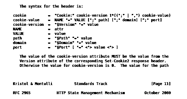 Abb. "datatracker.ietf.org/doc/html/rfc2965", txt-Version, S. 11, "[d]as Konzept [des Cookie im Hypertext Transfer Protocol, HTTP] wurde ursprünglich von Netscape Communications entwickelt und im 1994 veröffentlichten [Internetbrowser] Netscape Navigator implementiert. [...] 1995 begann die IETF [Internet Engineering Task Force] die Arbeit an einer Spezifikation, die als RFC [Request for Comments] standardisiert werden sollte. 1997 wurde die Spezifikation als RFC 2109 veröffentlicht [...]. Als bekannt wurde, dass die Cookie-Implementierung des Internet Explorers [des Internetbrowsers der konkurrierenden Firma Microsoft, später von 'Edge' abgelöst] zur neuen Spezifikation inkompatibel war, begann die Arbeit an einer neuen Version. Diese wurde im Jahr 2000 als RFC 2965 veröffentlicht" (WP). Mit Cookies sind Sessions möglich, damit werden Logins erleichtert, d.h. personalisierte Darstellungen, Rollenzuweisung im Content-Management-System, Social Media und Tracking.