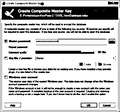 Abb. "KeePass Password Safe, Eingabe des Hauptschlüssels", Open Source Passwortverwaltung von Dominik Reichl, Veröffentlichungsdatum 16. November 2003, Bild von Dominik Reichl unter GNU General Public License Version 3 (modifiziert). Password Safe von Bruce Schneier, eine andere Open Source Software, wurde ursprünglich schon 1997 für Counterpane Systeme entwickelt, offizieller Release war der 15. Januar 2002.