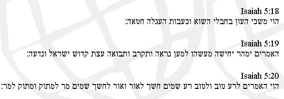 Transkription Johannes G.: Isaiah 5:18-20, 2003: "Hoi moschchei he'avon b'chavlei ha schav w ca'avot ha agala chata'a. Ha omrim j'maher jacheischa ma'asehu l'ma'an nir'eh w tikrav w tavoah azat k'dosch jisrael w neda'a. Hoi ha omrim la ra tov w la tov ra, samim choschech l'or w or l'choschech, samim mar l'matok u matok l'mar."