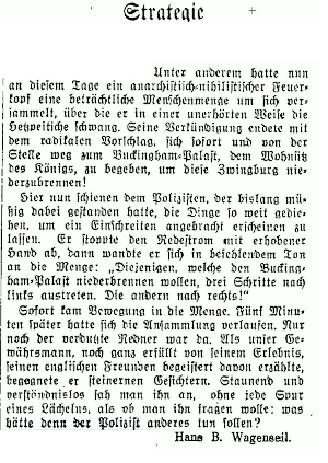 Kurt Wagenseil wird in Haft genommen, 23.02.1935. In der Anekdote "Strategie" vom 14. Februar 1935, veröffentlicht in der Schweizer Zeitung "Der Bund" unter dem Namen von Hans B., tritt "ein anarchistisch-nihilistischer Feuerkopf" auf, verbunden mit einem Lob der für selbstverständlich erklärten englischen deeskalierenden Art im Umgang mit der Drohung des Mannes, den Buckingham Palace niederzubrennen, was sich indirekt als Kritik am Umgang des Nazi-Regimes mit dem Reichtagsbrand lesen lässt.