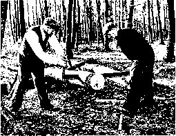 Abb. "Two lumberjacks with a two-man crosscut saw, or 'misery whip'" ('Zwei Holzfäller mit einer Kreuzschnitt-Trummsäge, oder ›Elendsschaukel‹'), 19. Jh., Public Domain.