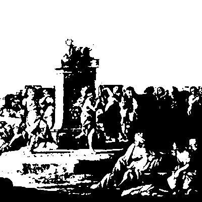 Fig. left at the bottom: "Dance around the Golden Calf", before 1725, National Museum of Serbia, Giuseppe Gambarini, 1680 - 11 September 1725. Fig. izquierda en la parte inferior: "Danza alrededor del becerro de oro", antes de 1725, Museo Nacional de Serbia, Giuseppe Gambarini, 1680 - 11 de septiembre de 1725. Fig. right at the top: "The Ladder", a so called "Calotype", a kind of early photograph, 1843. David and the ladder to heaven and other episodes belong to early forms of a shamanism-like religion. The Flood and other stories are taken from Babylonian context during exile. After it Ester repeats in Susa the rational way of Zipporah under the Persian reign of king Ahasueros or Xerxes I. Fig. superior derecha: "La Escalera", un llamado "calotipo", una especie de fotografía antigua, 1843. David, la escalera al cielo y otros episodios pertenecen a formas tempranas de una religión similar al chamanismo. El Diluvio y otras historias provienen del contexto babilónico durante el exilio. Después de ello Ester repite en Susa el camino racional de Séfora bajo el reinado persa del rey Asuero o Jerjes I.